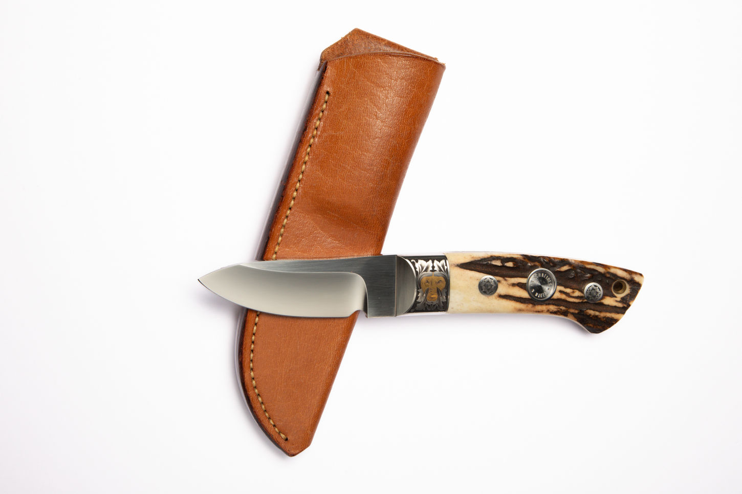 The metal pins used to secure the handle scales are not merely functional; they are decorative elements.The large central pin is engraved with his maker's mark: "H. SCHNEIDER MAKER". The two smaller pins are beautifully crafted with intricate floral or starburst patterns.