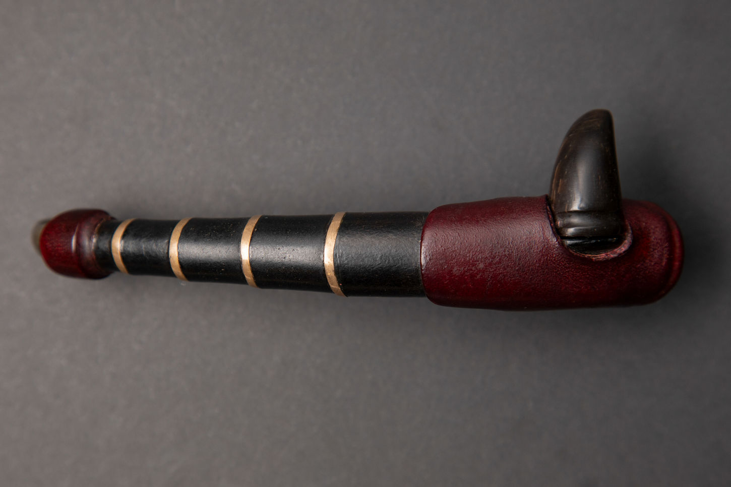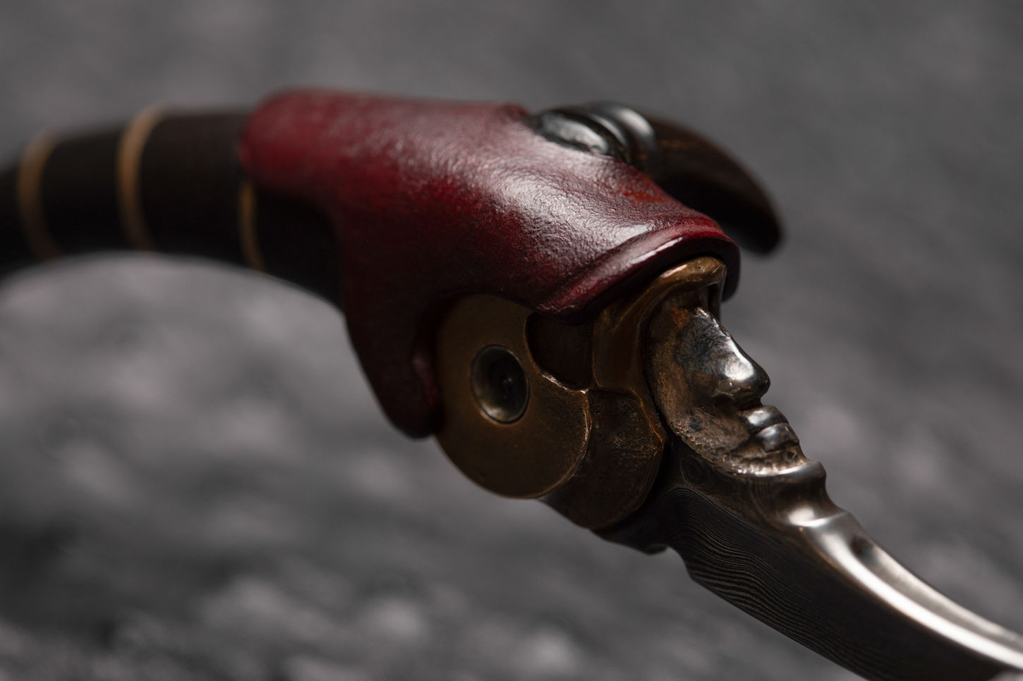 An Arthropod's Morphology. A masterful contrast of materials—the dark handle, deep-red leather, bronze-toned metal, and silver blade—intertwine harmoniously. The blade's curve is as vicious as a scorpion's stinger, and its faint Damascus pattern bestows a touch of ancient legacy upon this modern creation."